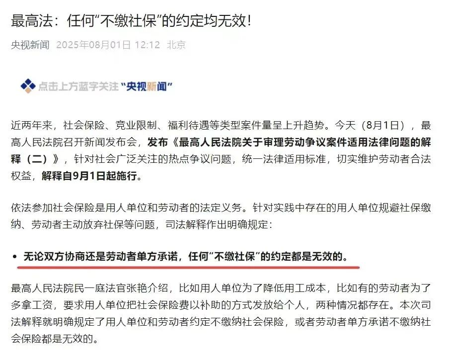 话题源头,是最高法发布的关于审理劳动争议案件适用法律问题的解释。相关内容概而言之,就是用人单位与劳动者不管用什么形式约定不缴社保,法院都会认定无效;如果用人单位未依法缴纳社保,劳动者离职时要求支付补偿,打官司会胜诉。