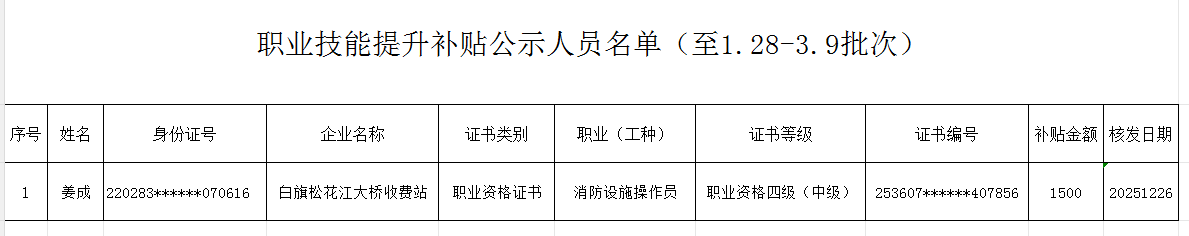 以上1人(后附详细名单)为申请并审核符合享受职业技能提升补贴人员,现依法进行公示,