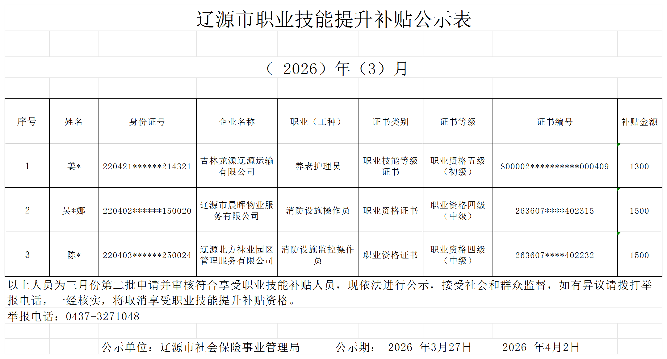 辽源市职业技能提升补贴公示表(2026)年(3)月