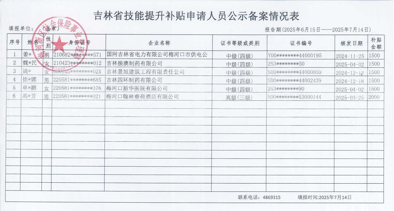 梅河新区社会保险事业管理局关于符合申领技能提升补贴的企业职工的公示
