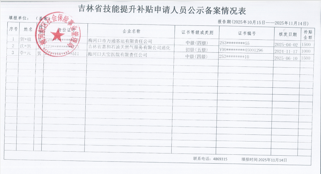 梅河新区社会保险事业管理局关于符合申领技能提升补贴的企业职工的公示