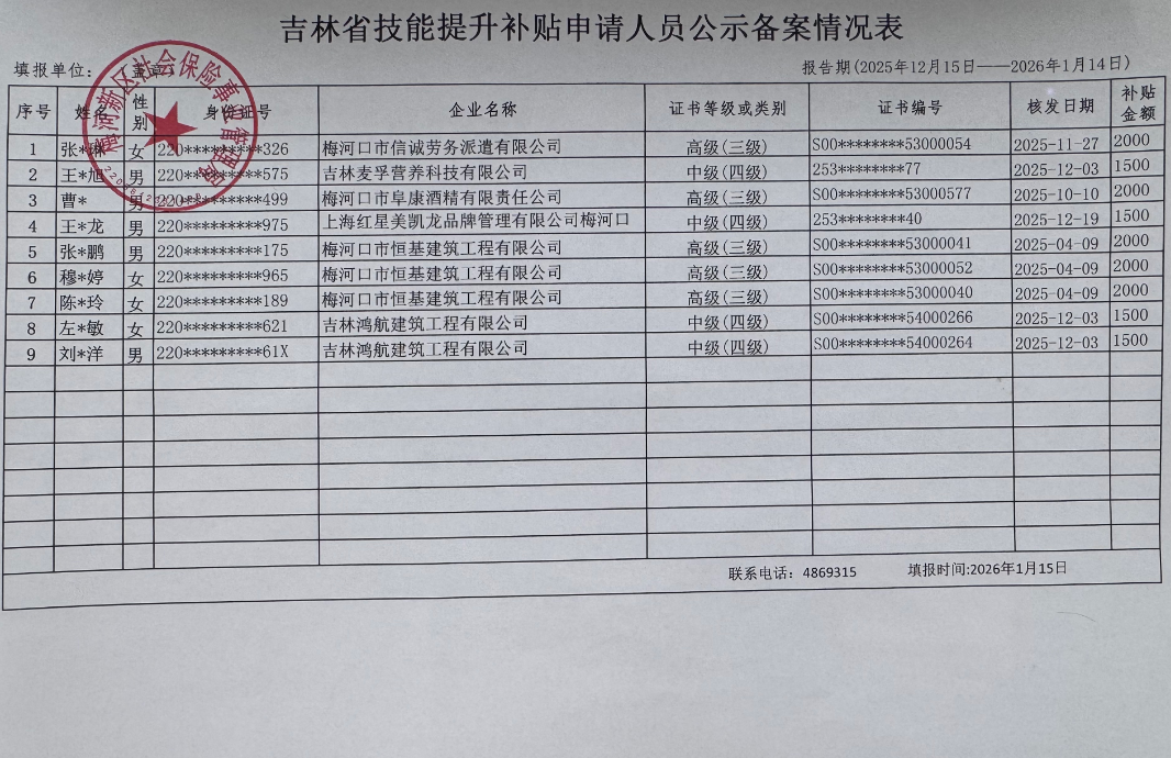 梅河新区社会保险事业管理局关于符合申领技能提升补贴的企业职工的公示