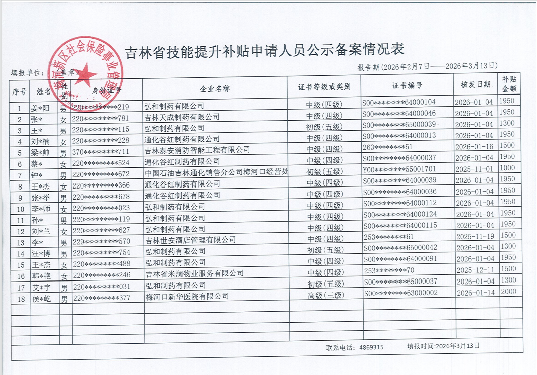 梅河新区社会保险事业管理局关于符合申领技能提升补贴的企业职工的公示