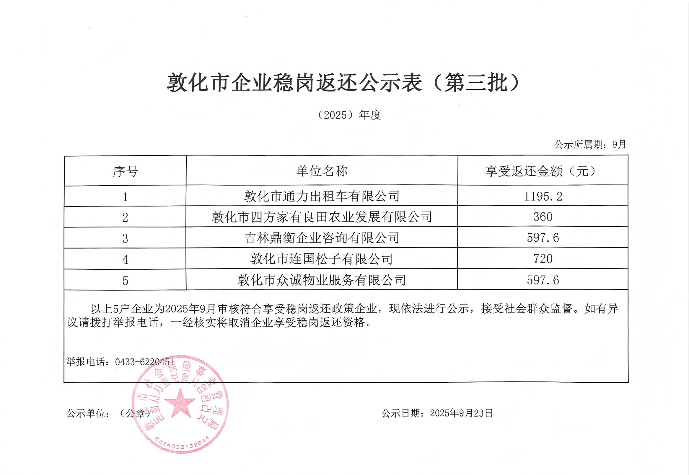 2025年度敦化市企业稳岗返还公示表(第三批)