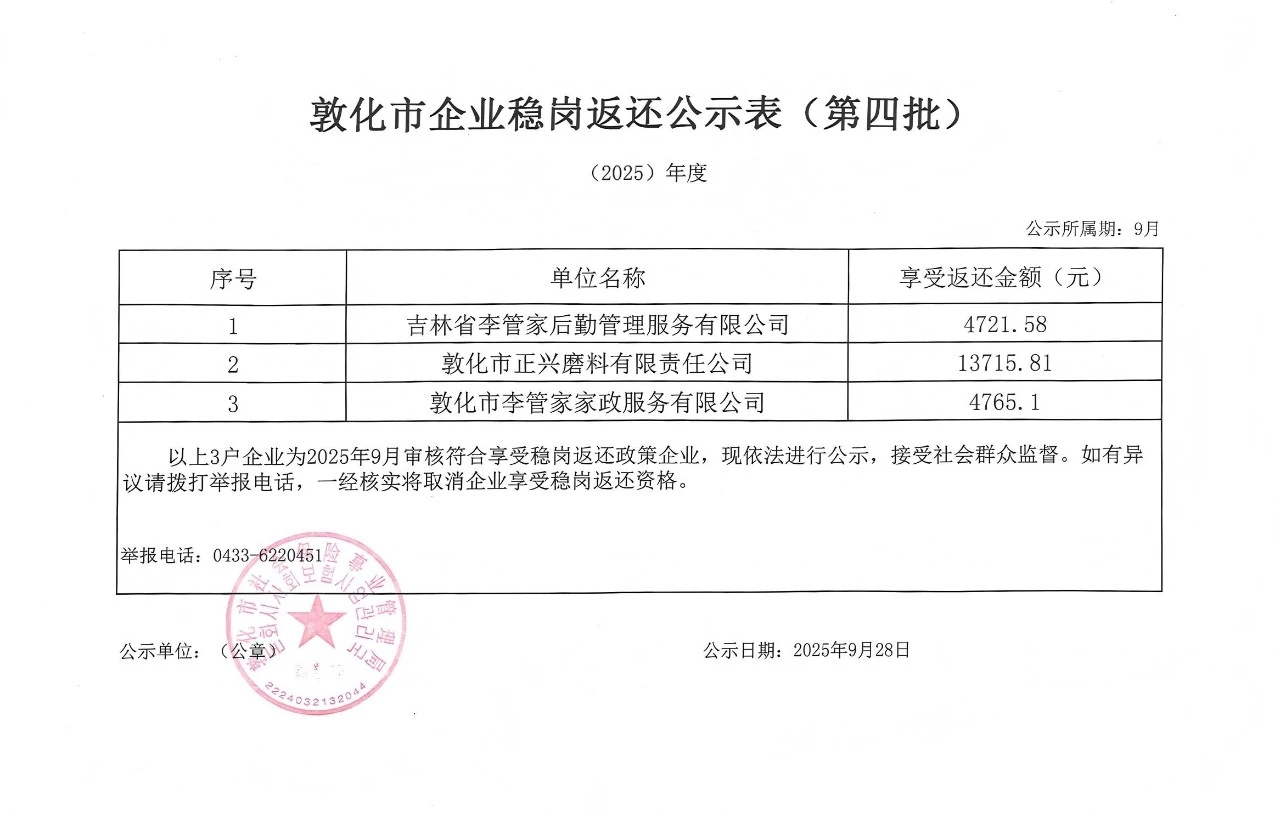 2025年度敦化市企业稳岗返还公示表(第四批)