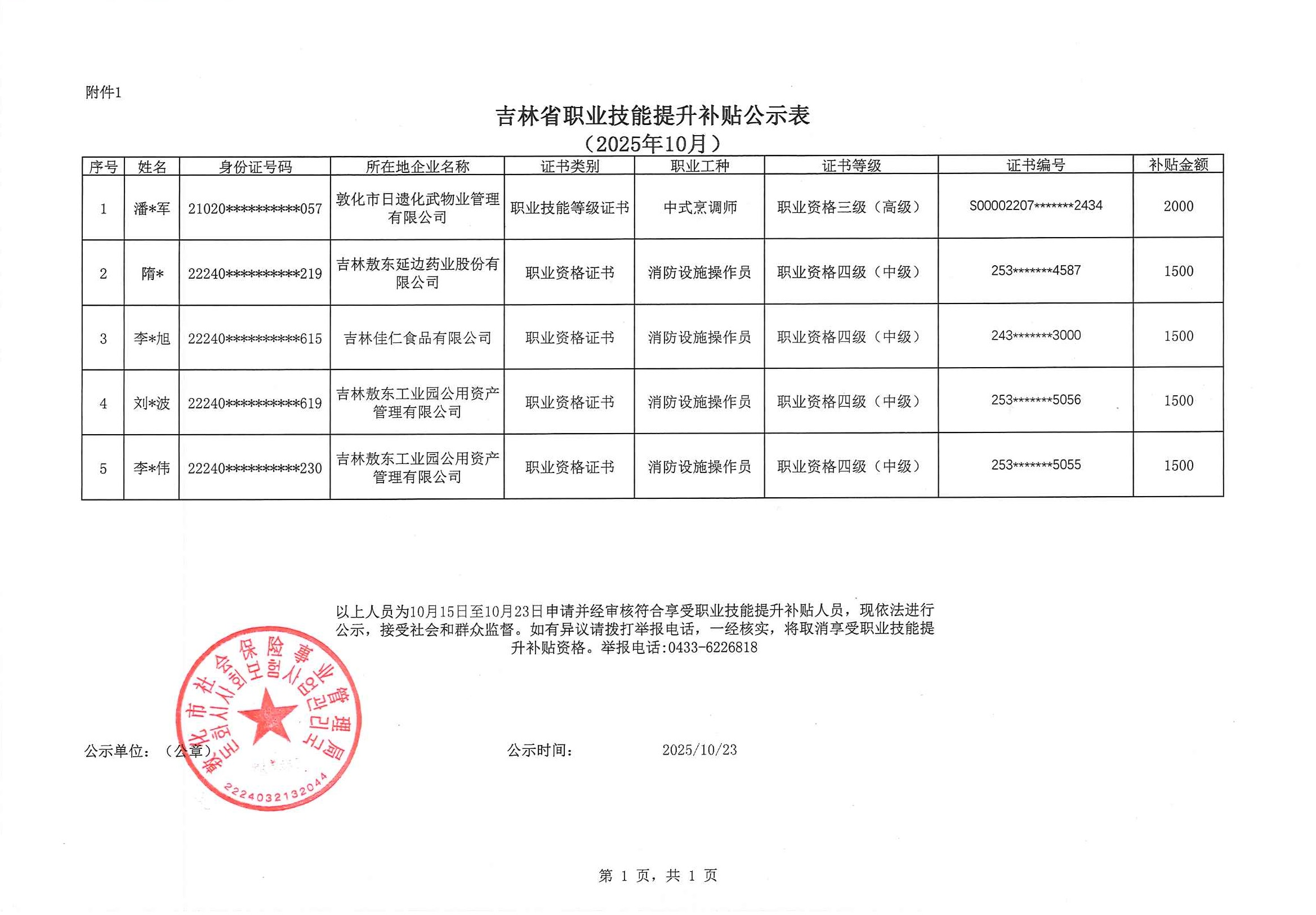 敦化市2025年10月职业技能提升补贴公示表2