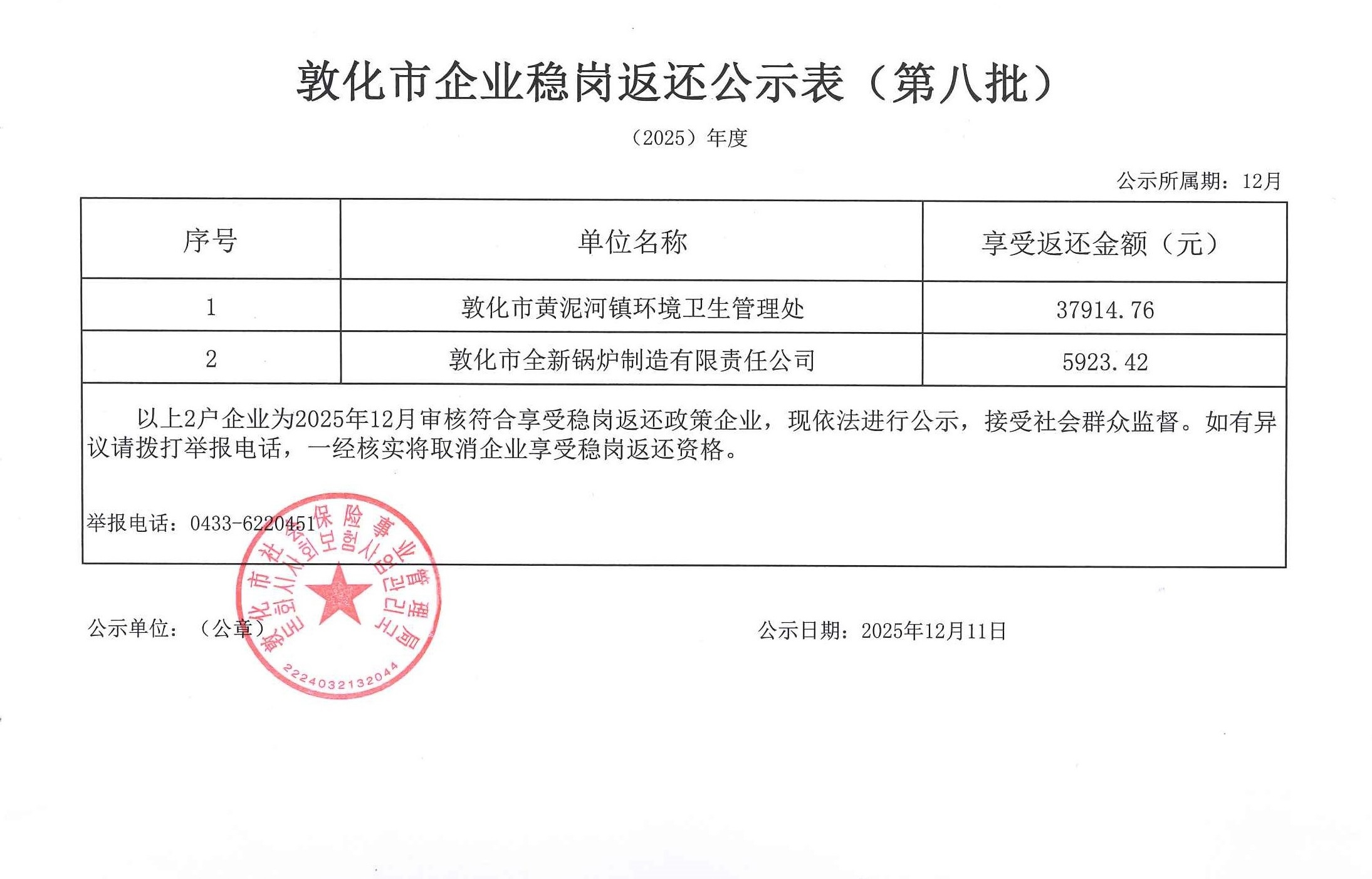 2025年度敦化市企业稳岗返还公示表(第八批)