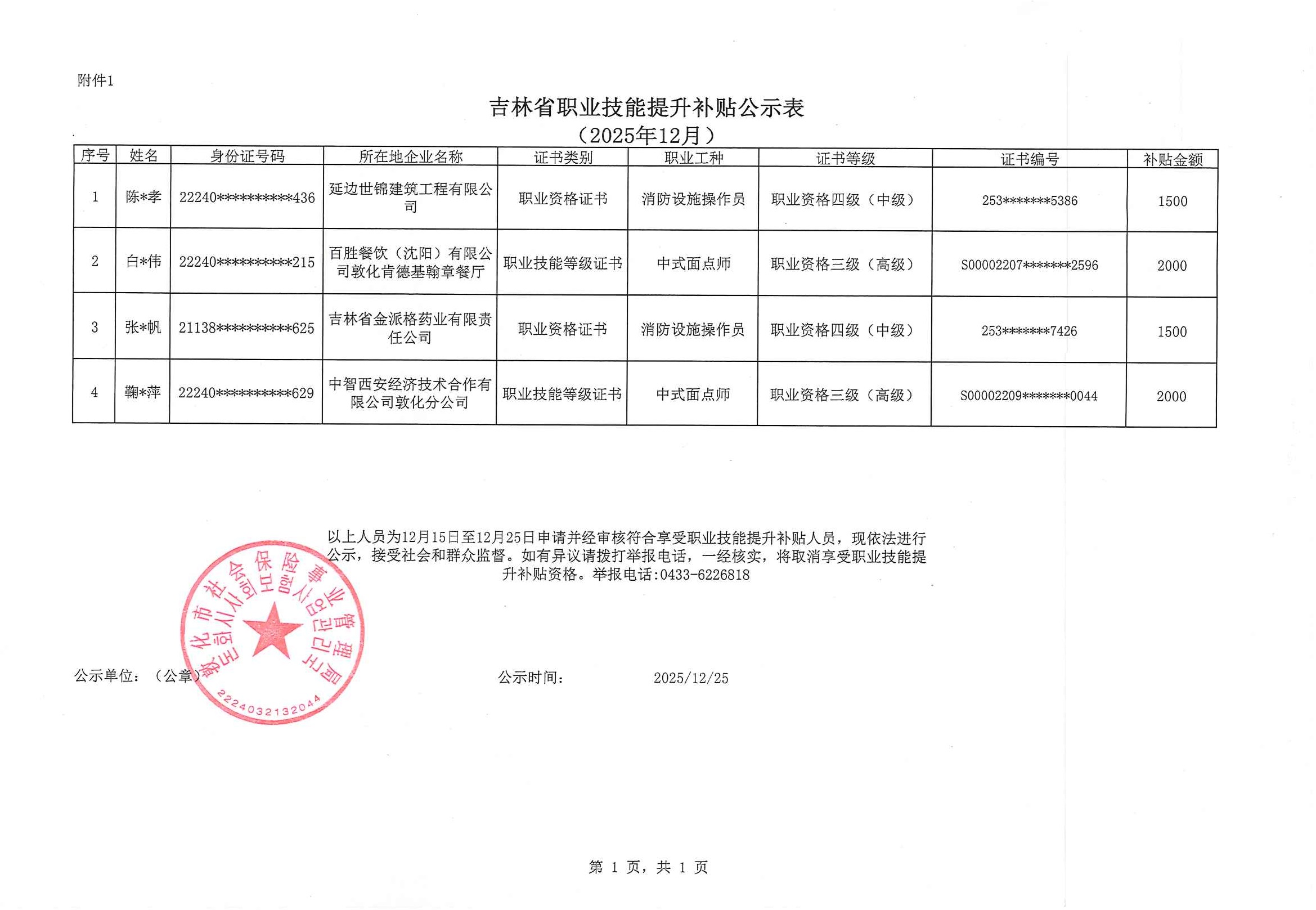 敦化市2025年12月职业技能提升补贴公示表2