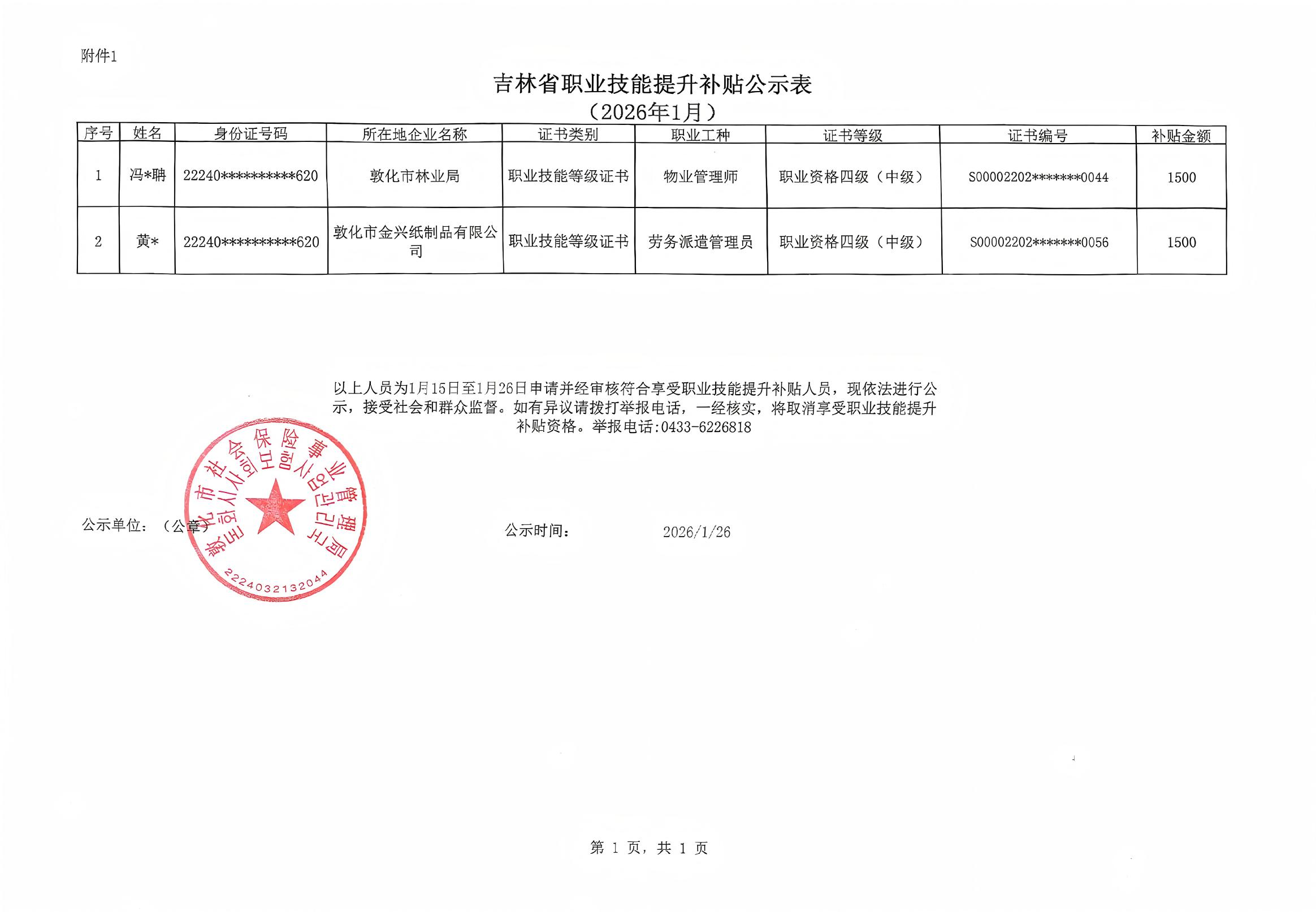 敦化市2026年1月职业技能提升补贴公示表2