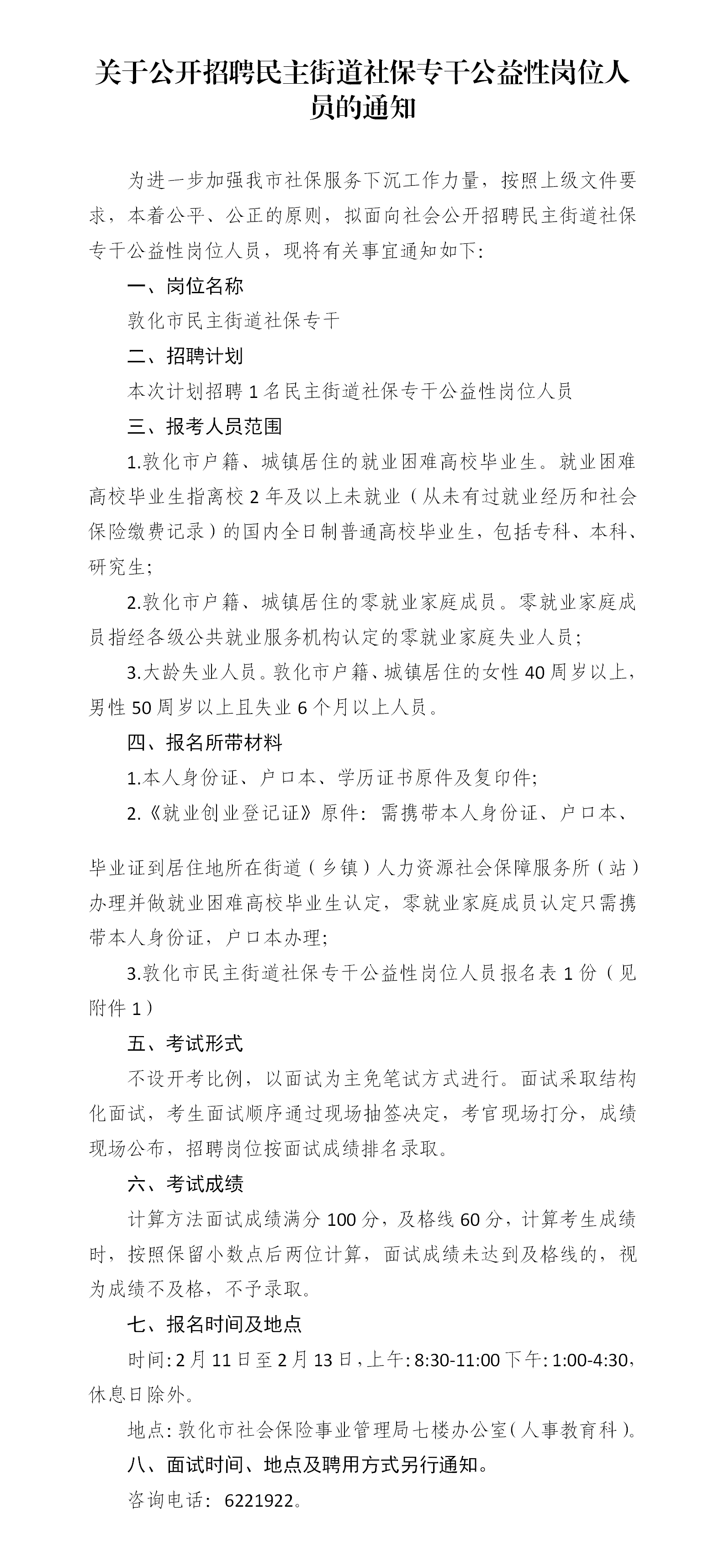 关于公开招聘民主街道社保专干公益性岗位人员的通知