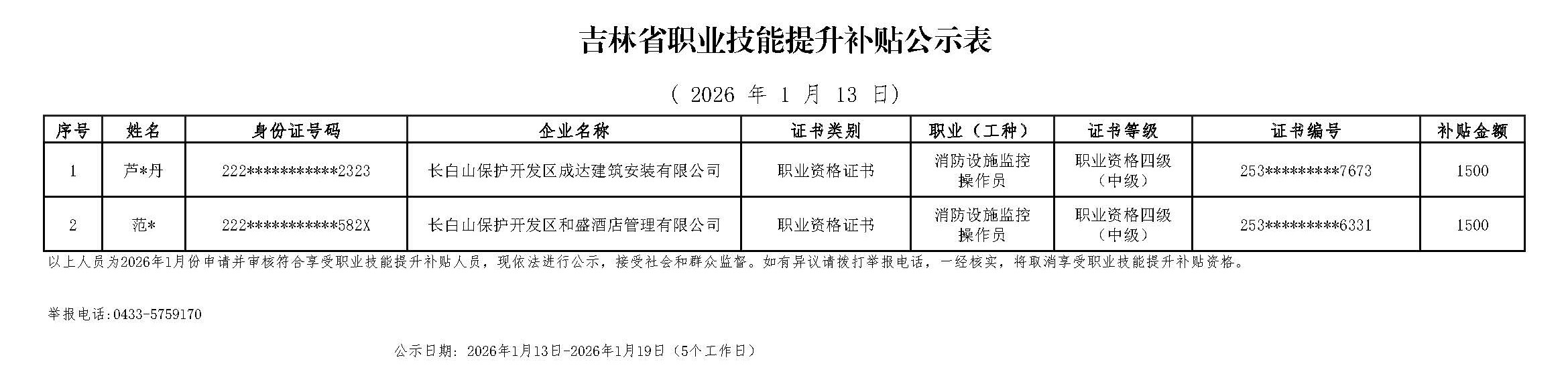 吉林省职业技能提升补贴公示表