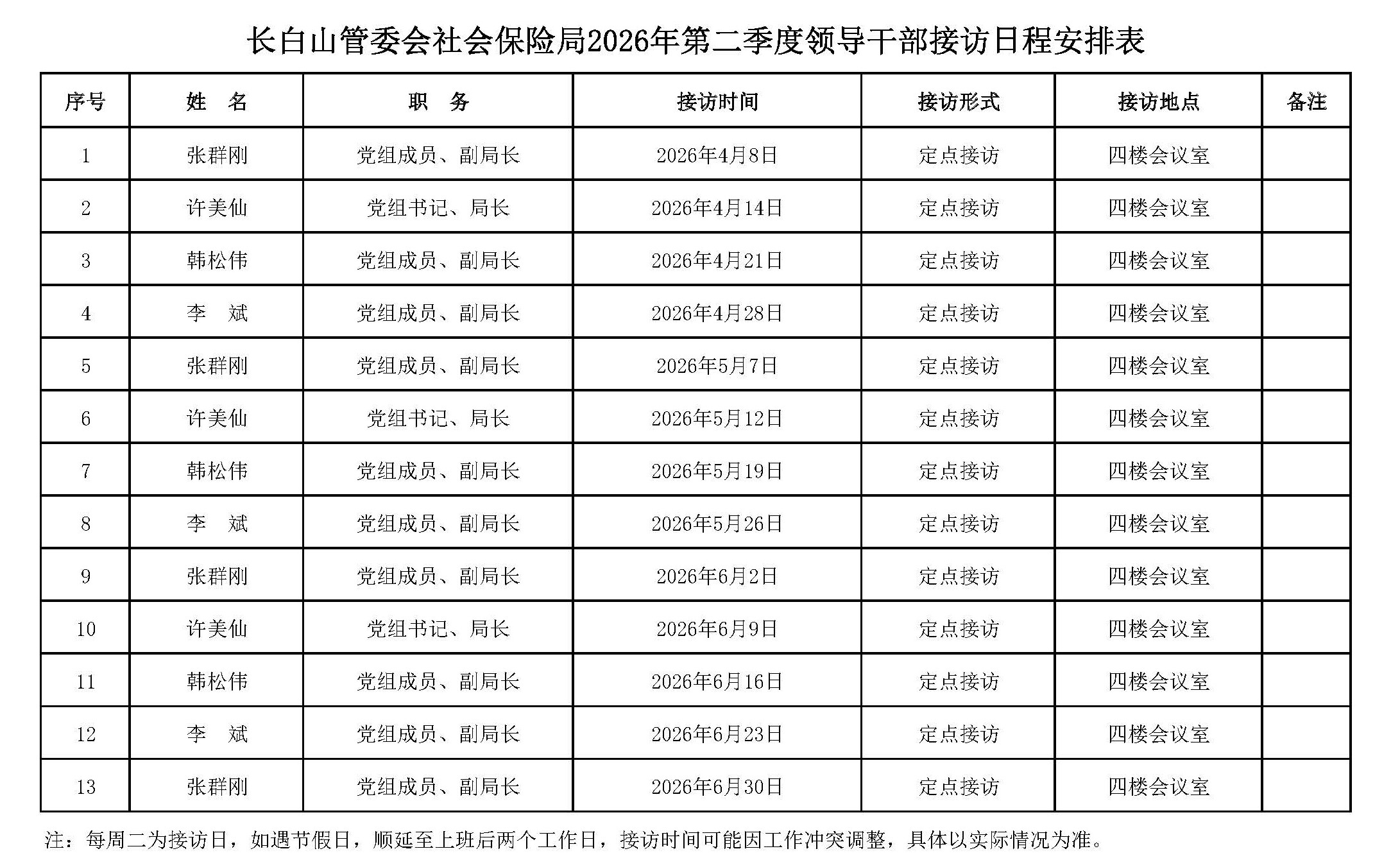 长白山管委会社会保险局2026年第二季度领导干部接访日程安排表